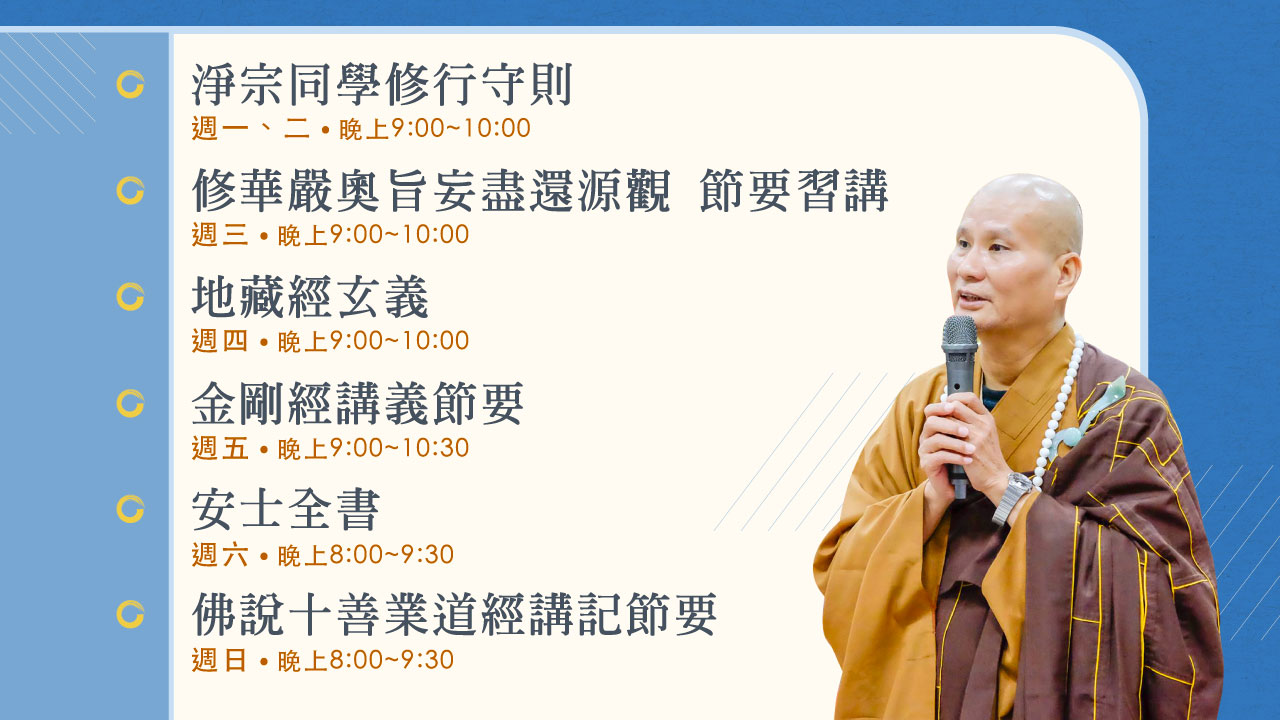 1/29晚上7:00華藏念佛堂恭請悟道法師宣講《佛說十善業道經講記節要》,網路直播,歡迎大家線上聽講,同霑法益。相關資訊敬請參閱…